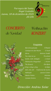 Konzert / Concierto Ángel Custodio 18/12/2025 Programa Baix d’una penyeta Cantique de Jean Racine Gloria de Vivaldi (del Gloria RV 589) You raise me up Komm, Gott, Schöpfer, heiliger Geist Weihnachts Wiegenlied The Ground Ding-a Ding-a Ding Still, still, still Hallelujah (Cohen, Emerson) Adeste Fideles Cantate Domino (Mark Hayes) Die heilige Nacht